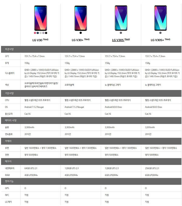 좀 더 쉽게 설명하자면 V30 씽큐와 V30플러스 씽큐는 기존 V30와 V30플러스에 씽큐 기능만 추가된 것이며, V30S 씽큐와 V30S플러스 씽큐는 V30와 V30플러스에 씽큐 기능과 더불어 램과 저장공간을 늘려서 6GB의 램과 각각 128GB와 256GB의 저장공간을 갖춘 모델이다. 설명이 복잡하게 들릴 수도 있겠지만 V30 씽큐와 V30플러스 씽큐는 기존 V30와 V30플러스에서 소프트웨어 업데이트만 이루어졌으며, S가 붙은 모델들은 소프트웨어뿐만 아니라 램과 저장공간의 업그레이드도 이루어진 모델이라고 보면 구분이 쉽다.